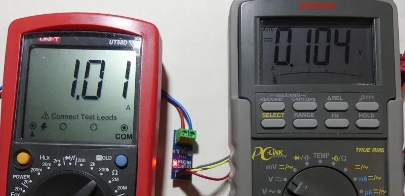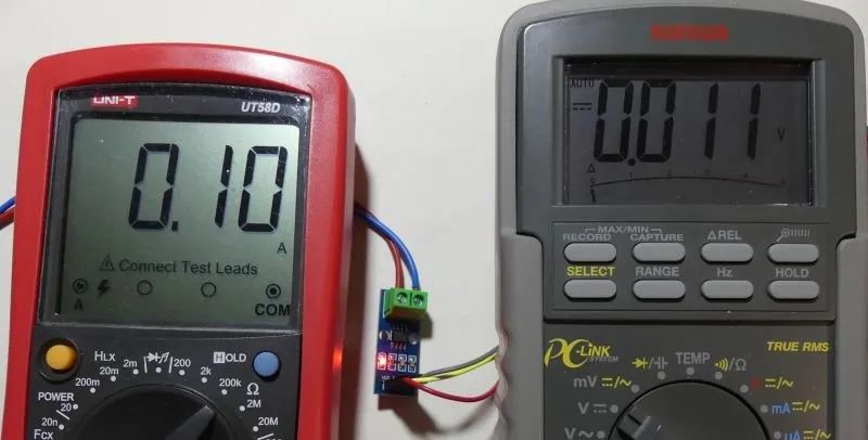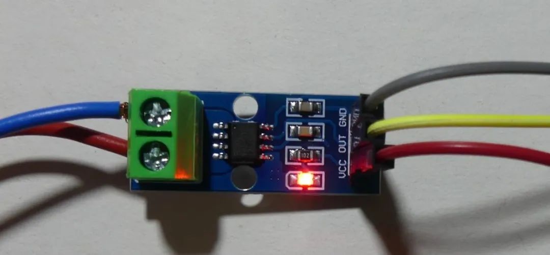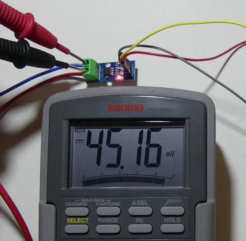 霍爾效應(yīng) U->I 轉(zhuǎn)換器的一個(gè)例子是 ACS712ELCTR-20A-T 電路,其測量范圍為 20A,隔離有效值為 2.1kV。為方便起見,我們將使用一個(gè)焊接有 ACS712 芯片和引線的現(xiàn)成 ME067 模塊。我們?yōu)殡娐诽峁?5V 電壓,在測量電路中沒有電流流動(dòng)的情況下,我們將在輸出端獲得 2.5V 電源電壓的一半。根據(jù)電流流動(dòng)的方向,電壓值將相對(duì)于最初的 2.5V 降低或升高。對(duì)于該電路,電壓變化與電流的關(guān)系為 100 mV/A,不同測量范圍的電路具有不同的 mV/A 比值。