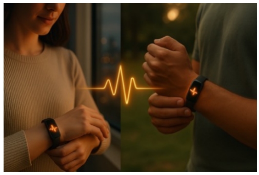 在快速約會場景中,情感表達(dá)往往難以啟齒。這款手環(huán)能將心率轉(zhuǎn)換為低頻振動,實現(xiàn) “無聲傳情”。當(dāng)一方心率超過設(shè)定閾值,另一方手環(huán)會同步振動節(jié)奏。兩只設(shè)備可通過輕觸快速配對并實現(xiàn)無線同步,提供了一種安靜直觀、借助觸覺實現(xiàn)的情感傳達(dá)方式。