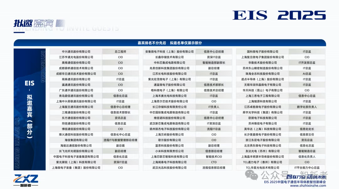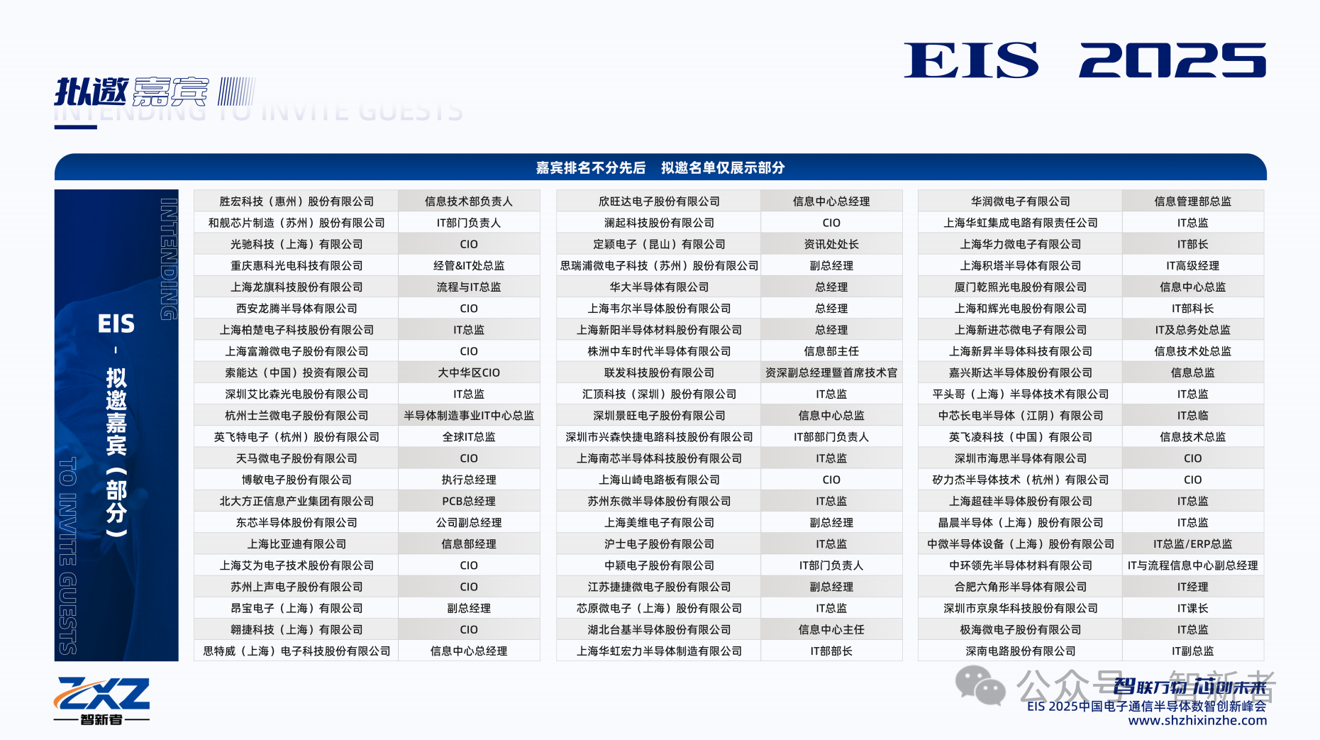 為了進(jìn)一步推動(dòng)電子通信半導(dǎo)體產(chǎn)業(yè)創(chuàng)新發(fā)展,“EIS 2025 中國(guó)電子通信半導(dǎo)體數(shù)智創(chuàng)新峰會(huì)”, 以 “智聯(lián)萬物·芯創(chuàng)未來 ”為主題, 將于 2025 年 10月 24日在上海隆重舉辦。EIS 2025 誠(chéng)摯邀請(qǐng) 220+ 來自電子通信半導(dǎo)體行業(yè)等知名企業(yè)高管、CIO、信息化與數(shù)字化負(fù)責(zé)人、電子通信半導(dǎo)體領(lǐng)域信息化解決方案供應(yīng)商等行業(yè)領(lǐng)袖蒞臨現(xiàn)場(chǎng)。本屆峰會(huì)將聚焦大數(shù)據(jù)、AI、5G、區(qū)塊鏈、云計(jì)算、RPA、中臺(tái)建設(shè)、物聯(lián)網(wǎng)、智能制造、供應(yīng)鏈、智慧研發(fā)等當(dāng)下行業(yè)熱點(diǎn)話題,多維度分享行業(yè)領(lǐng)袖及專家優(yōu)秀案例,助力企業(yè)尋求最佳的解決方案。共同探討數(shù)字化、智能化趨勢(shì)下電子通信半導(dǎo)體產(chǎn)業(yè)的發(fā)展和創(chuàng)新。我們希望共同分享業(yè)內(nèi)領(lǐng)先企業(yè)的成功案例和實(shí)踐經(jīng)驗(yàn),促進(jìn)企業(yè)創(chuàng)新發(fā)展、業(yè)界交流和合作,為行業(yè)向好發(fā)展注入新動(dòng)能,助力電子通信半導(dǎo)體行業(yè)數(shù)智化創(chuàng)新發(fā)展。