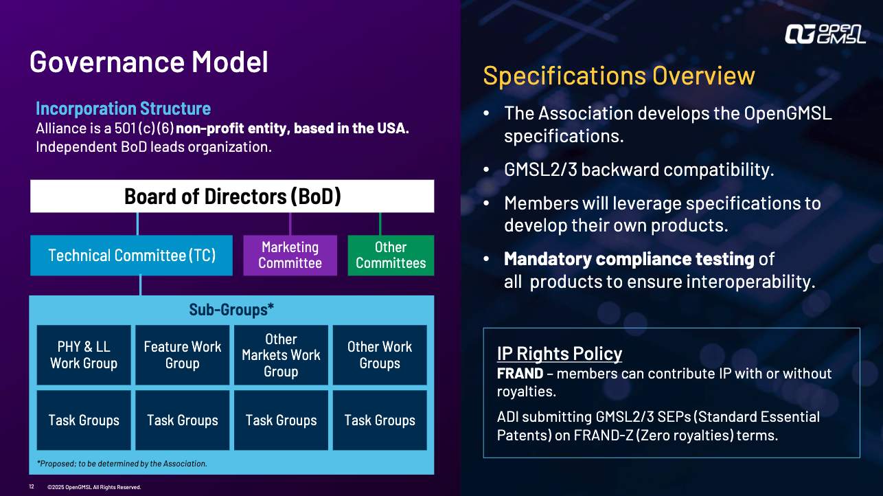 OpenGMSL則意在將這一成熟技術(shù)推向開放化,打造為全球通用的行業(yè)標(biāo)準(zhǔn)。Balagopal解釋,OpenGMSL旨在通過標(biāo)準(zhǔn)化協(xié)議,促進(jìn)高清視頻和傳感器數(shù)據(jù)的無縫連接,助力OEM和供應(yīng)商降低成本、增強(qiáng)供應(yīng)鏈韌性并加速產(chǎn)品上市。它支持自動駕駛、ADAS和沉浸式信息娛樂等前沿應(yīng)用,為軟件定義汽車提供堅(jiān)實(shí)的連接基礎(chǔ)。作為一個非營利組織,OpenGMSL協(xié)會由獨(dú)立董事會管理,成員包括汽車OEM、一級供應(yīng)商(Tier-1)、半導(dǎo)體制造商以及測試設(shè)備開發(fā)商等生態(tài)伙伴。這種開放模式打破了專有技術(shù)的局限,邀請更多行業(yè)參與者共同推動技術(shù)創(chuàng)新。