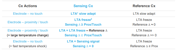 2“LTA凍結(jié)”意味著當(dāng)LTA被用作接近/觸摸閾值的參考時(shí),它不會(huì)被主動(dòng)更新。通常,當(dāng)達(dá)到接近閾值的時(shí)候,LTA將凍結(jié)。