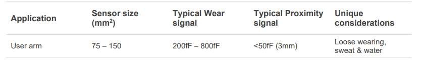 典型的“穿戴狀態(tài)檢測”應(yīng)用需要區(qū)分電容測量值中非常小的差異,它因傳感器尺寸和觸摸與接近喚醒的特性影響而產(chǎn)生。