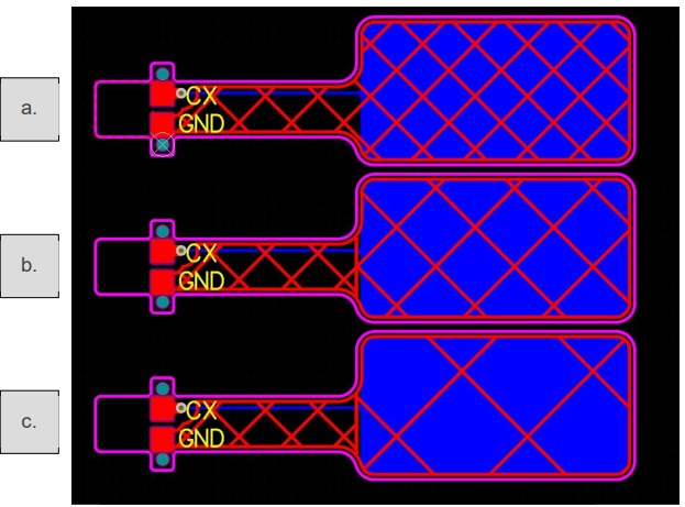 根據(jù)下一節(jié)提供的示例,評(píng)估所需的感應(yīng)盤總面積(單位為mm2)。請(qǐng)注意,網(wǎng)格地(hatched pour)將縮短接近距離,這基于寄生負(fù)載的數(shù)量——請(qǐng)將其保持到最小值,以獲得最佳靈敏度。