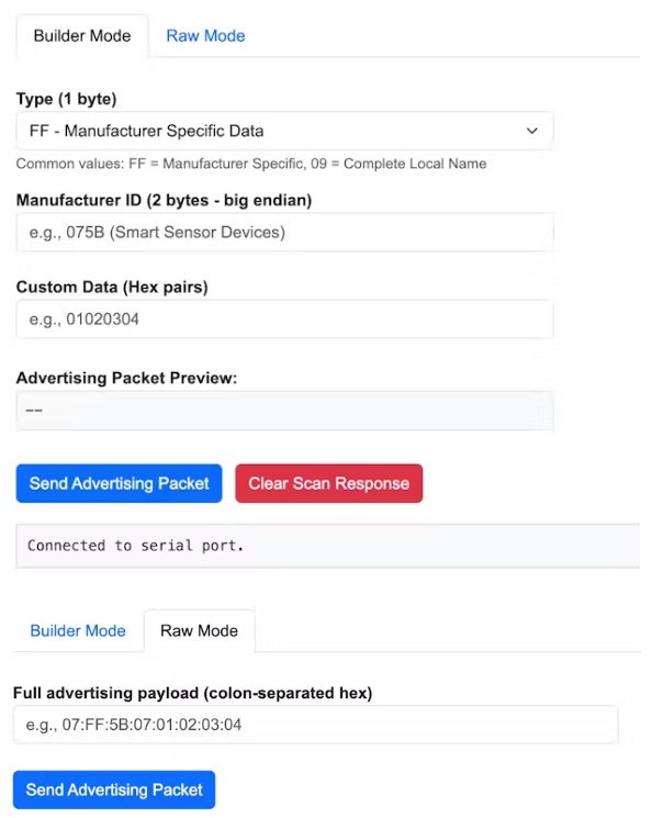 ?提供兩種模式:建設(shè)者模式:輸入數(shù)據(jù)字段長度,類型,制造商ID,和自定義的有效負(fù)載原始模式:粘貼一個完整的,冒號分隔的廣告包直接