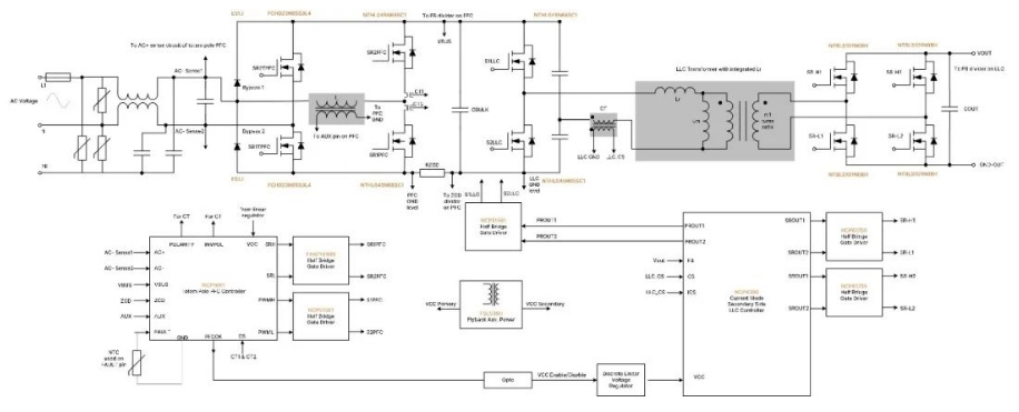 針對(duì)較高的功率(4.0kW-6.6kW),請(qǐng)考慮交錯(cuò)式圖騰柱PFC配置。安森美的650V EliteSiC MOSFET,例如適合3kW應(yīng)用的NTH4L032N065M3S和NTH4L023N065M3S,以及適合6.6kW應(yīng)用的NTH4L015N065SC1或SiC共源共柵JFET(如UJ4SC075009K4S),是高頻橋臂的出色選擇。NTHL017N60S5H或SiC組合式JFET(如UG4SC075005L8S)適用于低頻橋臂。圖5提供了一個(gè)基于SiC的3kW圖騰柱PFC和LLC電源的實(shí)例。(圖5所示為基于SiC的3kW圖騰柱PFC和LLC電源示例。)