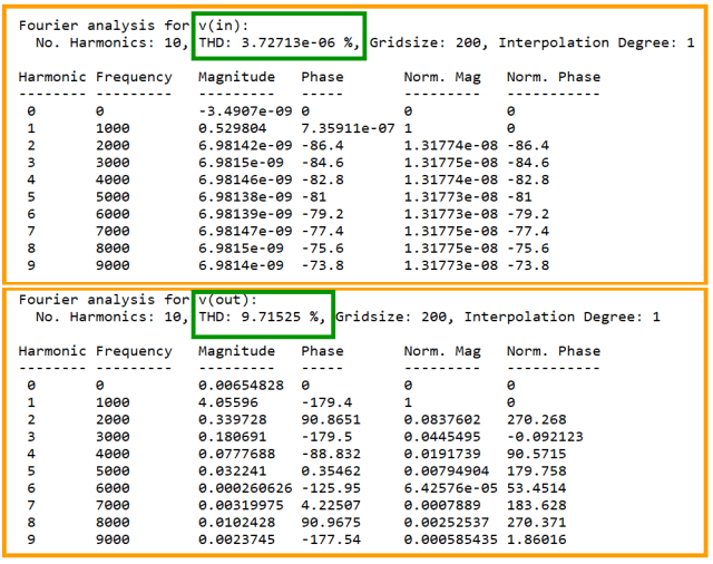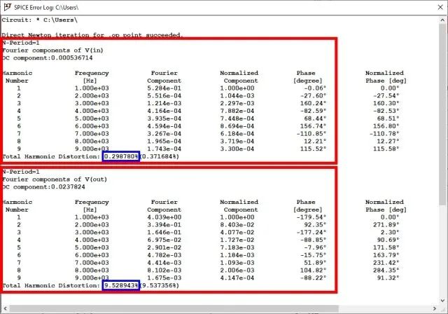 即使使用ngspice,諧波失真的計(jì)算也非常簡(jiǎn)單。為此,在這種情況下,用戶必須在系統(tǒng)提示符下以批處理模式運(yùn)行軟件,命令如下: