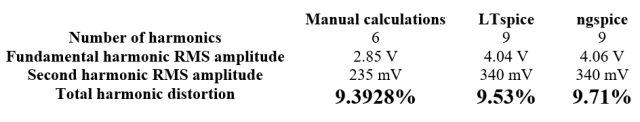 下表顯示了對(duì)于示例電路的信號(hào)諧波失真百分比的匯總。手動(dòng)計(jì)算是使用仿真頻譜分析儀進(jìn)行的,但所使用的三種方法的失真百分比最終值非常相似。