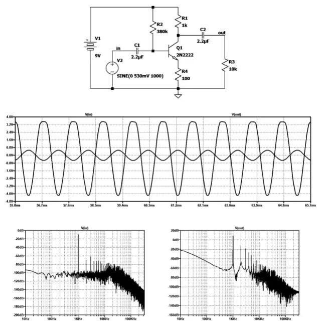 - 中間是輸入信號(hào)(VIN)和輸出信號(hào)(VOUT)的波形圖,后者要大得多,但也非常失真。