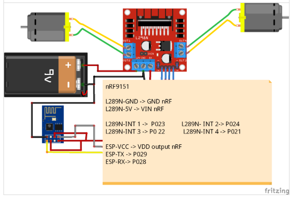 機器人的大腦是一個nRF9151 -一個微控制器處理LTE和GPS,與電機控制通信。它連接到一個L298N電機驅(qū)動器,該驅(qū)動器控制兩個直流電機。