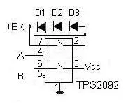 它使用雙配電開關(guān)TPS2092代替BJT開關(guān)。如果遇到過(guò)載或短路,該電路還能限制電流。注意: