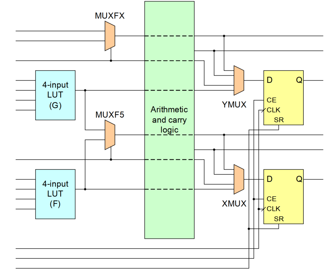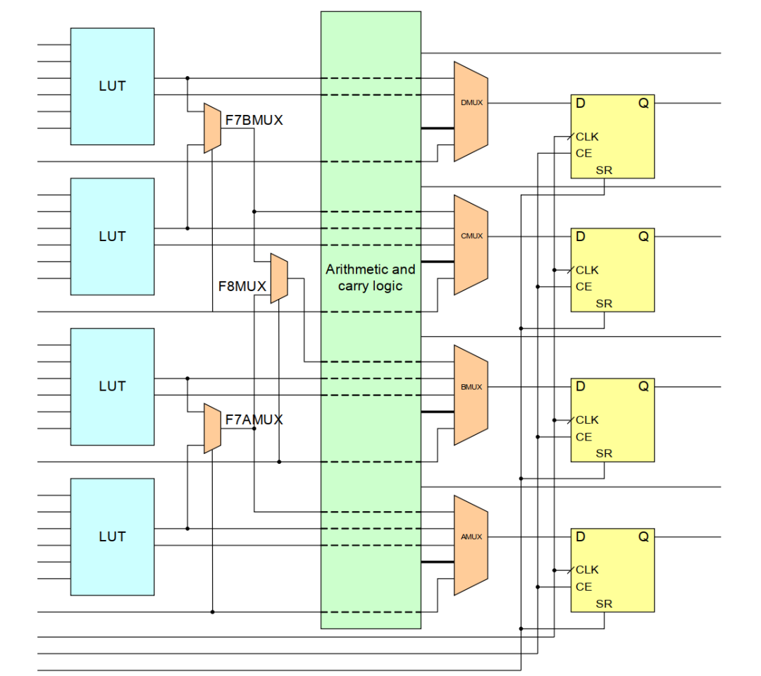 每個(gè)切片有 4 個(gè)查找表(LUT)和 4 個(gè)寄存器位。
