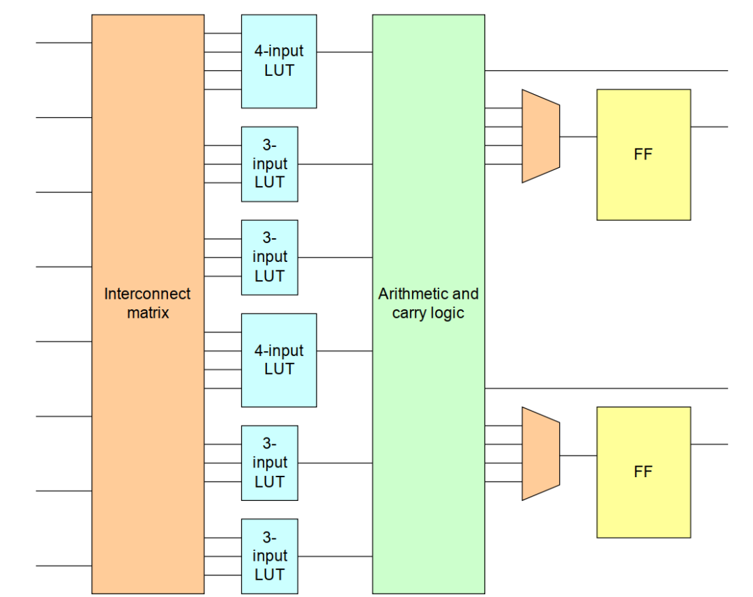 兩個(gè)四輸入查找表和四個(gè)三輸入查找表用于組合邏輯實(shí)現(xiàn)。