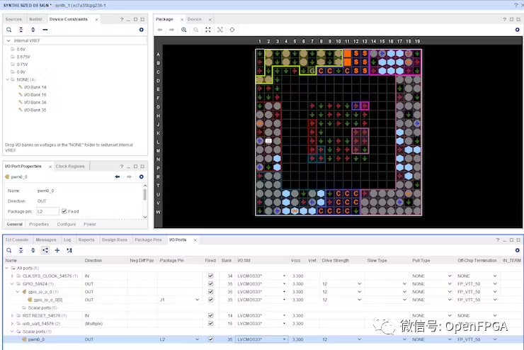 綜合完成后,我們可以打開(kāi)綜合視圖并將 IO 分配給 GPIO 和定時(shí)器輸出 - 對(duì)于 GPIO,引腳是 J1,對(duì)于 PWM,引腳是 L2