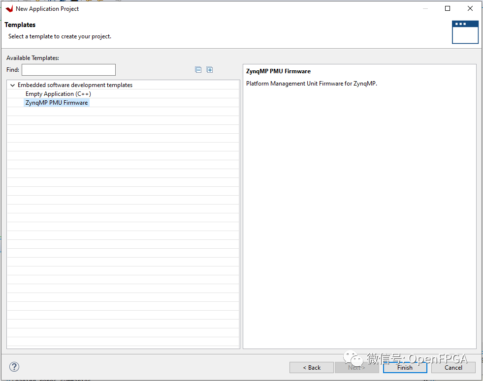 首先,我們需要?jiǎng)?chuàng)建 PMU 固件,該固件是在 Vitis 中的新應(yīng)用程序向?qū)е嗅槍?PMU 處理器創(chuàng)建的??驁D非常簡單,只使用 PS即可。