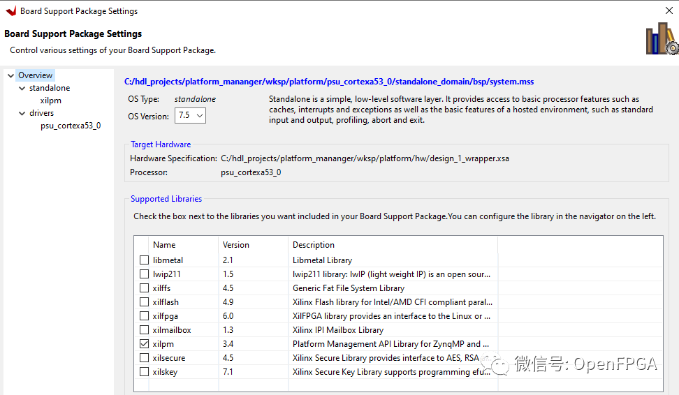 構(gòu)建 PMU 固件后,我們需要在板支持設(shè)置中啟用 XilPM 庫。