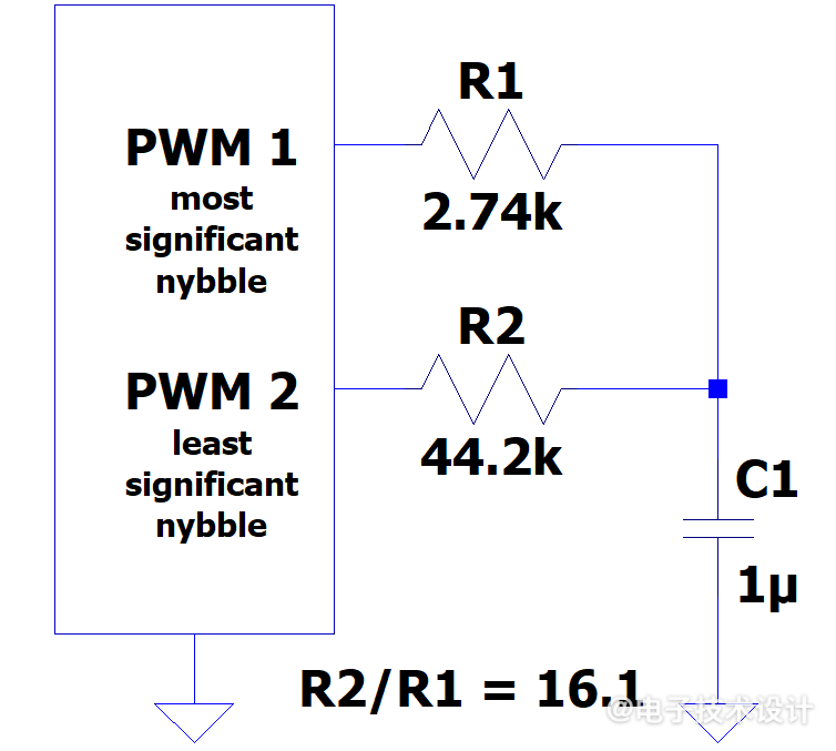 圖1:實現(xiàn)交流衰減最簡單方法的完整電路,其中電容器連接在PWM輸出端的兩個電阻器的結(jié)點與地之間。