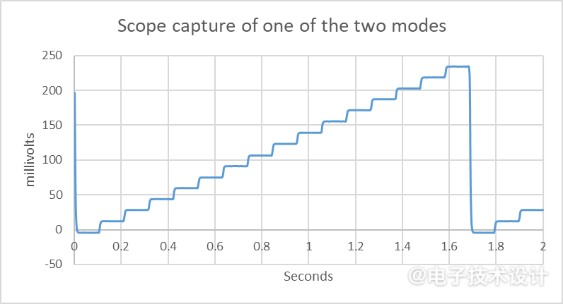 圖2給出了兩種模式之一的示波器捕獲波形;兩種模式的屏幕截圖無法區(qū)分,分辨率約為18mV。必須在R1-R2-C1結(jié)點和負(fù)直流電壓之間連接一個額外的電阻(未顯示)。在不影響R1-R2比率的情況下,這會將波形的電壓移至接近地的電壓,以便示波器可以以高分辨率顯示它。