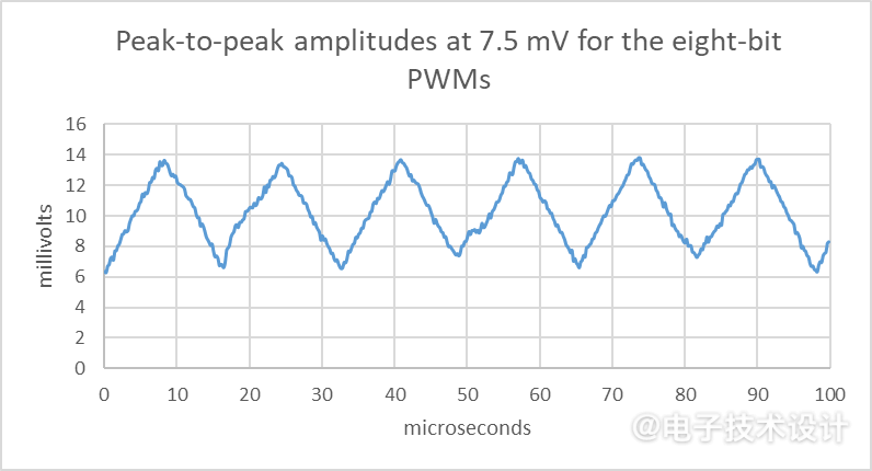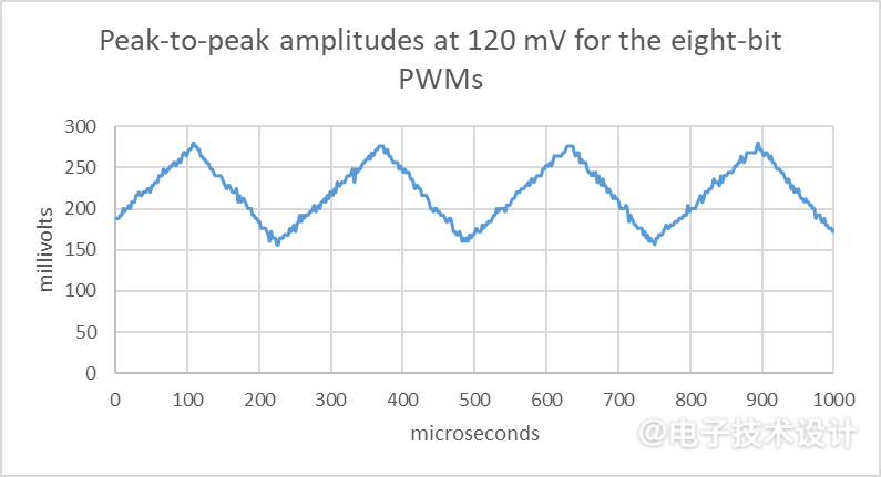 圖4:圖1電路中四位PWM電容器兩端的交流能量。四位PWM的周期和幅度比八位PWM小16倍。
