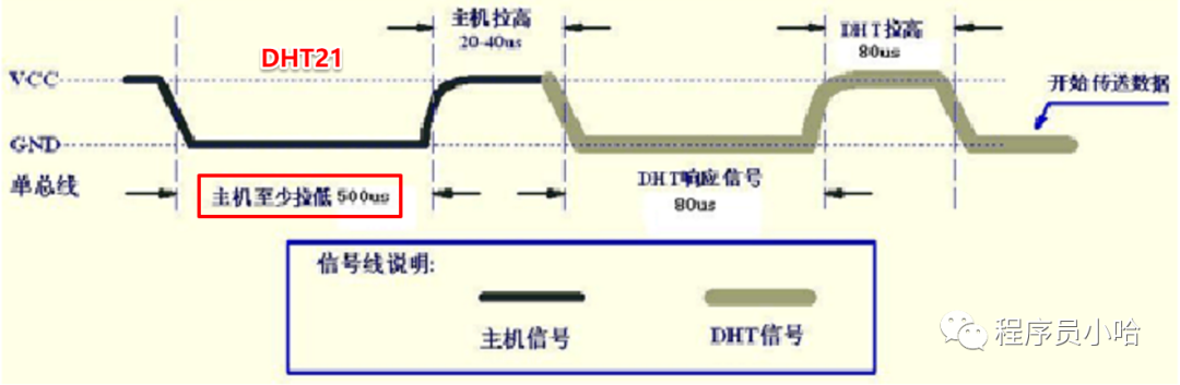 DHT11和DHT21的主線拉低的時間不同,DHT11主機(MCU)至少拉低18ms,DHT21主機(MCU)至少拉低500us,為了程序上兼容,我們一般將總線拉低25ms,這樣DHT11和DHT21的驅(qū)動程序就可以兼容了。