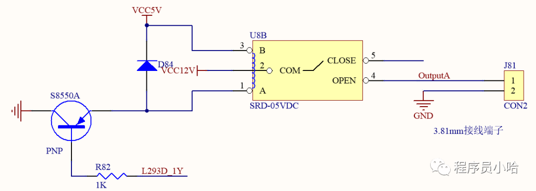 當(dāng)L293D_1Y輸出高電平5V時(shí),三極管未導(dǎo)通,此時(shí)電磁鐵斷電,繼電器的COM端與CLOSE引腳相連,J81端子沒有電壓輸出,連接負(fù)載,負(fù)載不工作;