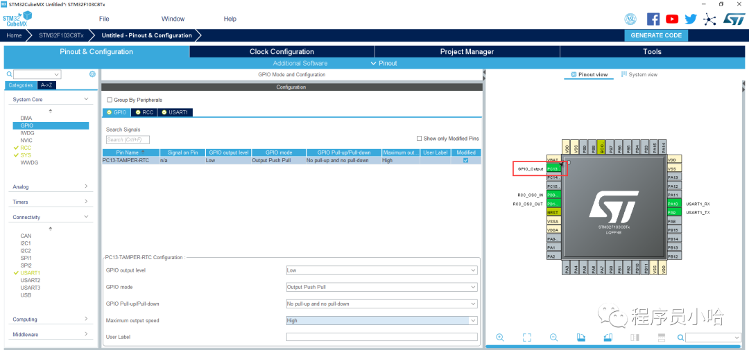 配置GPIO,本例使用STM32的核心板上的PC13驅(qū)動(dòng)LED: