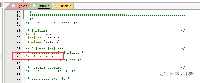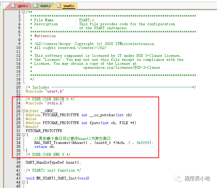 /* USER CODE BEGIN 0 */ #include "stdio.h" #ifdef __GNUC__ #define PUTCHAR_PROTOTYPE int __io_putchar(int ch) #else #define PUTCHAR_PROTOTYPE int fputc(int ch, FILE *f) #endif PUTCHAR_PROTOTYPE { //具體哪個(gè)串口可以更改huart1為其它串口 HAL_UART_Transmit(&huart1 , (uint8_t *)&ch, 1 , 0xffff); return ch; } /* USER CODE END 0 */