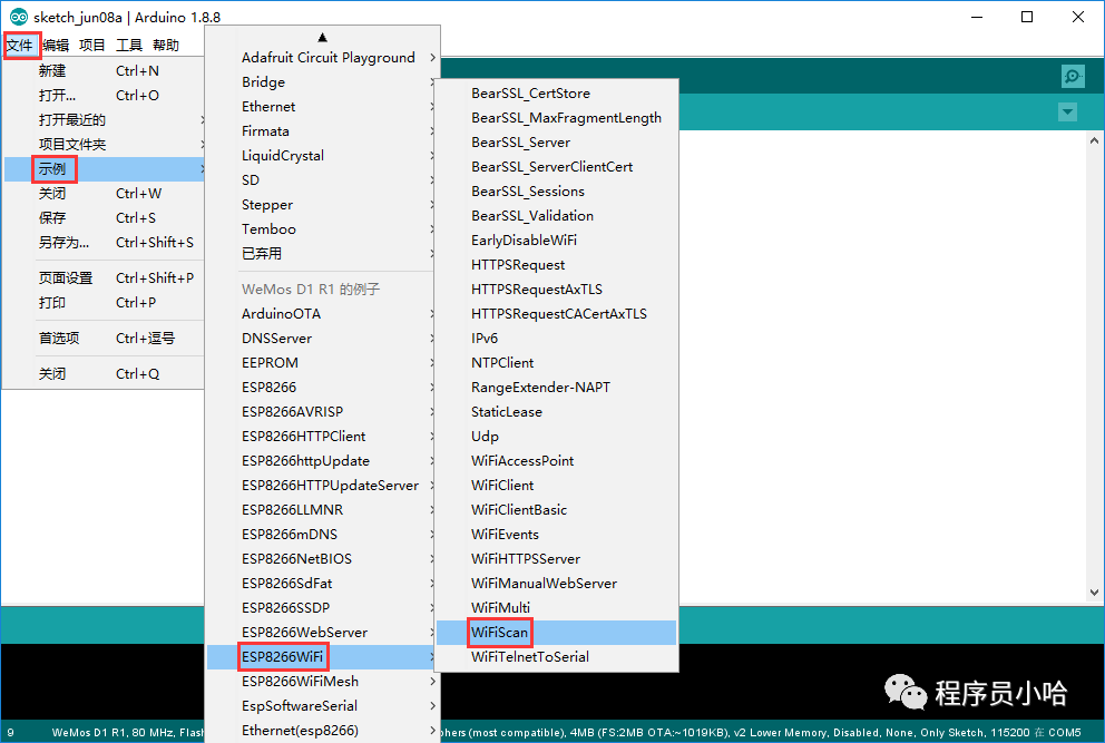 Arduino軟件菜單中的“文件”-->“示例”-->“WeMos D1 R1的例子”中有很多Demo代碼,大家可以自己下載驗證,學習一下。
