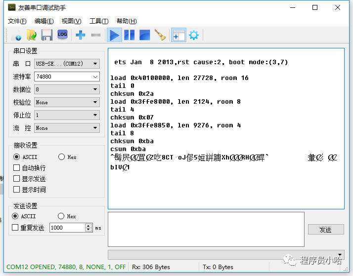 最開始顯示亂碼的原因是,因為esp8266模塊上電時,默認打印波特率為74880,而固件中的比特率是115200,所以我們在115200比特率下查看輸出,就是亂碼。使用友善之臂的串口調(diào)試助手,可以自定義串口比特率,設置為74880,那么顯示就正常了,但是固件輸出的信息又變成亂碼了。