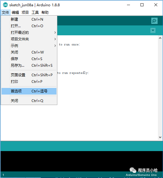 下載arduino-1.8.8-windows.zip,解壓之后,打開Arduino IDE “arduino.exe”,然后點擊選擇:文件-->首選項。