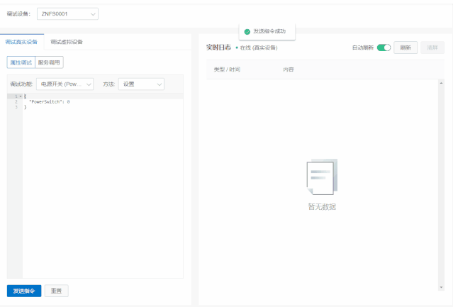 調(diào)試真實設(shè)備中,對電源開關(guān)設(shè)置為1,即{"PowerSwitch":1},在串口助手中我們收到指令{"PowerSwitch":1};