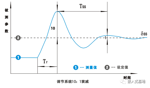 在部分調(diào)節(jié)系統(tǒng)中,由于采用4:1衰減比仍嫌振蕩比較厲害,則可采用10:1的衰減過程,如下圖所示。這種情況下由于衰減太快,要測量操作周期比較困難,但可測取從施加干擾開始至第一個(gè)波峰飛升時(shí)間Tr。