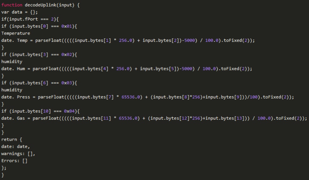 在TTN應(yīng)用程序中,您轉(zhuǎn)到Payload Formatter到Uplink選項(xiàng),在那里您選擇Custom JavaScript Formatter。將編寫一個(gè)函數(shù)來解碼HEX格式的數(shù)據(jù),如下所示: