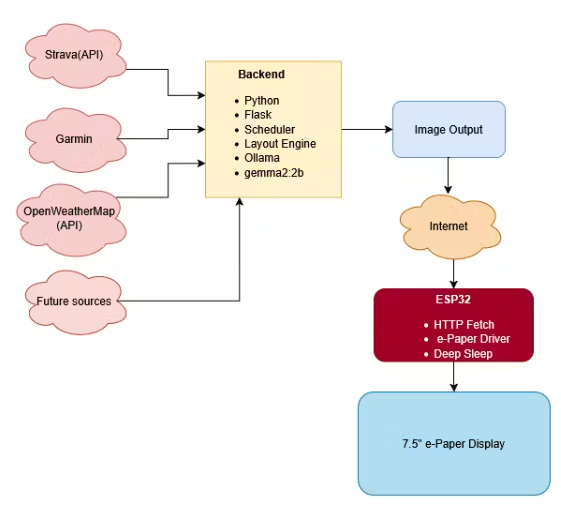 ?圖像通過(guò)Flask提供,并由ESP32定期獲取,ESP32將其顯示在7.5英寸的三色電子紙顯示器上。