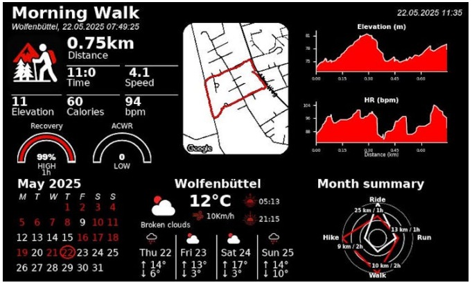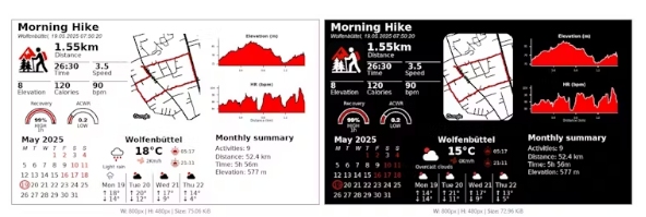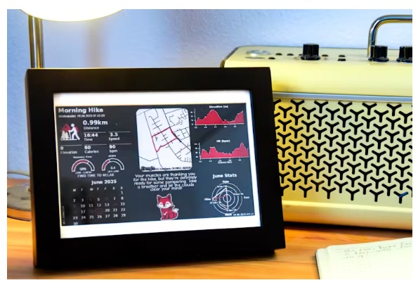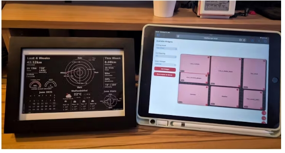 基于此,用戶可以隨心所欲地設(shè)計(jì)自定義小部件——從他們自己的數(shù)據(jù)源中提取數(shù)據(jù),或者使用Strava、Garmin和weather的內(nèi)置集成。該系統(tǒng)足夠靈活,可以支持文本、圖像、圖表或您希望在電子紙顯示中包含的任何視覺(jué)元素。