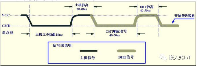 DHT單向數(shù)據(jù)傳輸?shù)臄?shù)據(jù)量大小為5Byte(40bit)。一次通信時(shí)長(zhǎng)約為3ms。