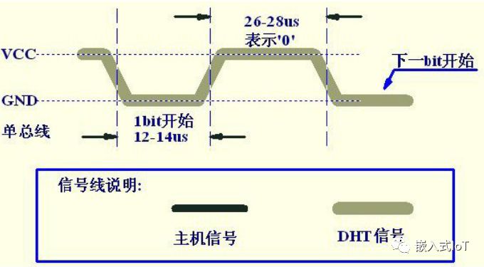 數(shù)據(jù)“0”,首先DHT把總線拉低12-14us然后拉高,高電平保持在26-28us這個(gè)范圍。表示“0”。