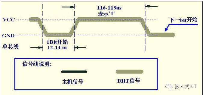 數(shù)字“1”,首先DHT把總線拉低12-14us然后拉高,高電平保持在116-118us這個(gè)范圍。表示“1”。