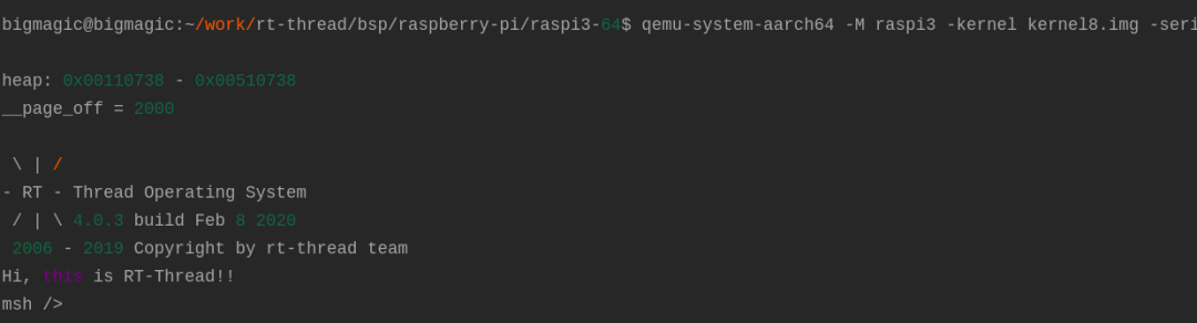 qemu-system-aarch64 -M raspi3 -kernel rtthread.elf -serial null -serial stdio -s -S