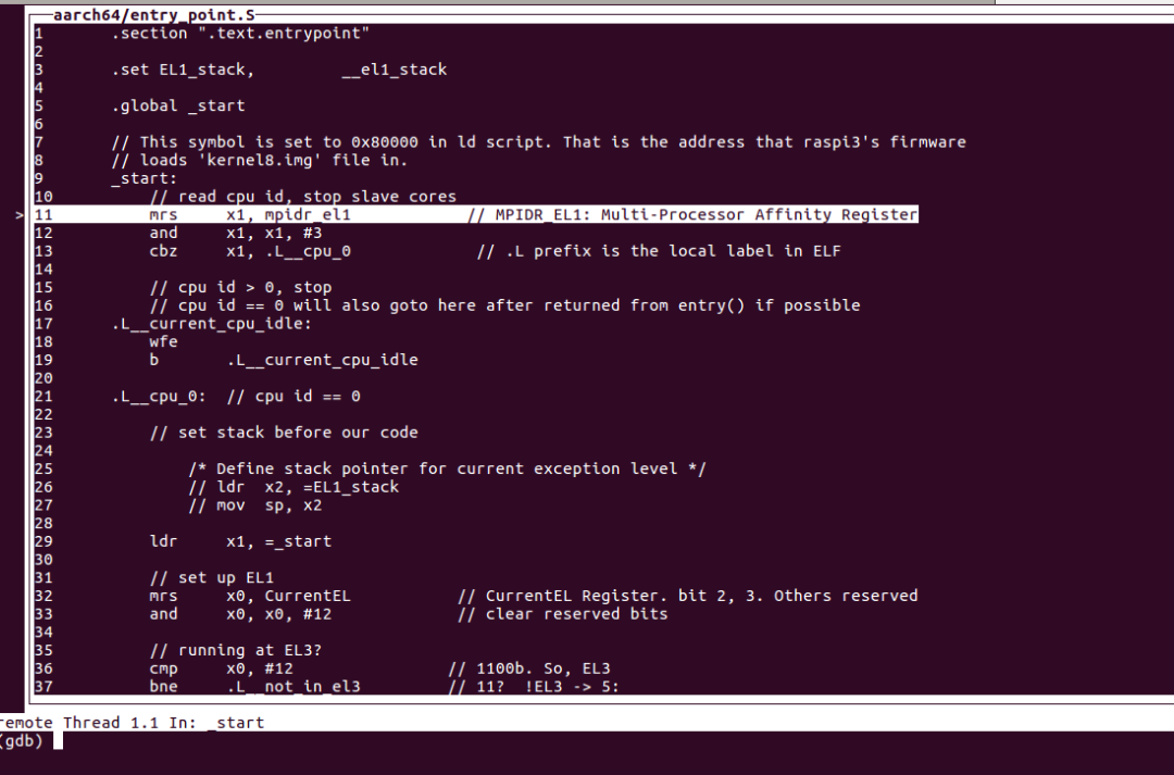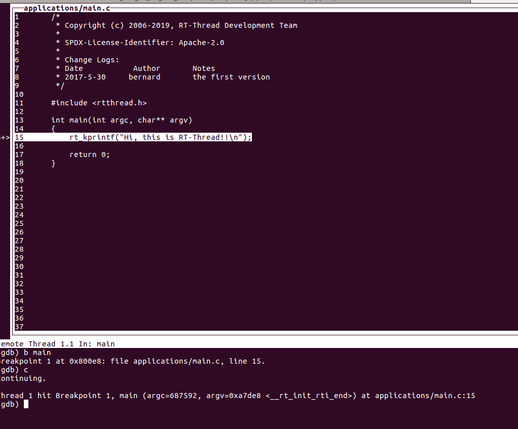 打開(kāi)需要調(diào)試的文件,輸入路徑file /home/bigmagic/work/raspberry-pi/src/rt-thread/bsp/raspi3-64/rtthread.elf這個(gè)路徑是需要調(diào)試的文件。