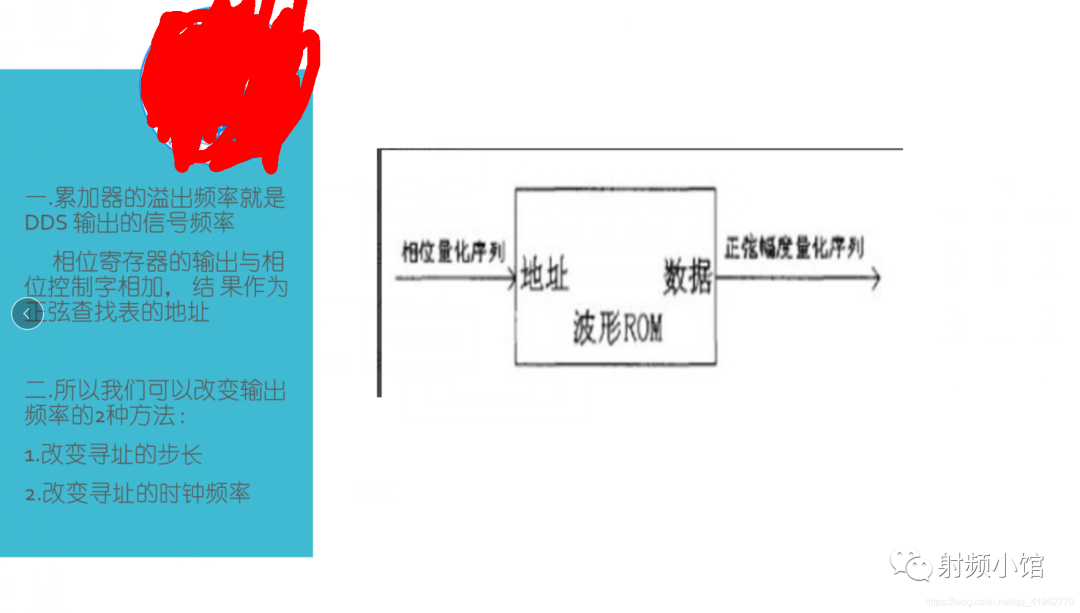 DDS信號發(fā)生器采用直接數(shù)字合成,英語名Direct Digital Synthesis,簡稱為DDS。把信號的發(fā)生器的頻率穩(wěn)定度,準確度提到與基準頻率相同的水平,并且可以在很寬的頻率范圍內(nèi)進行精細的調(diào)節(jié)。也就是說它對的誤差很小 與基準頻率之間的誤差很小??梢怨ぷ髟谡{(diào)制狀態(tài)??梢援a(chǎn)生任意波形。奈奎斯特采樣定理:奈奎斯特采樣定理解釋了采樣率和所測信號頻率之間的關(guān)系。闡述了采樣率fs必須大于被測信號最高頻率分量的2倍。該頻率常常被稱為奈奎斯特頻率fN。這是我用visio畫的一個DDS的結(jié)構(gòu)圖當一個參考時鐘過來 傳輸一個頻率控制字進入累加器在累加器中加入上一個參考時鐘的數(shù)據(jù),相加后進去寄存器,然后寄存器的輸出便是正弦查表的地址,通過這個數(shù)據(jù)在波形存儲區(qū)查表,再通過D/A轉(zhuǎn)換器和低通濾波器輸出。