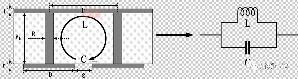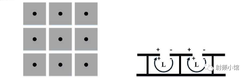 當(dāng)HIS結(jié)構(gòu)與電磁波相互作用時,矩形金屬貼片產(chǎn)生相應(yīng)的感應(yīng)電流,同時,因受到平行于貼片的電壓作用,會導(dǎo)致電荷在兩相鄰貼片末端之間大量積累,其可用電容來描述。而這些電荷又會沿著方形貼片、金屬化通孔和地板的路徑來回流動,與這些電流聯(lián)系在一起的就是磁場和電感。