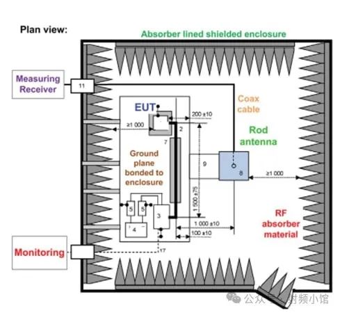 本文介紹的方法基于CISPR 25和ISO 11452-2,這些標(biāo)準(zhǔn)定義了從150 kHz開始測量無線干擾的限值和程序。所有設(shè)備必須放置在暗室內(nèi),該暗室會(huì)衰減所有所需帶寬內(nèi)的所有發(fā)射。吸收材料被添加到墻壁上,以去除反射能量。