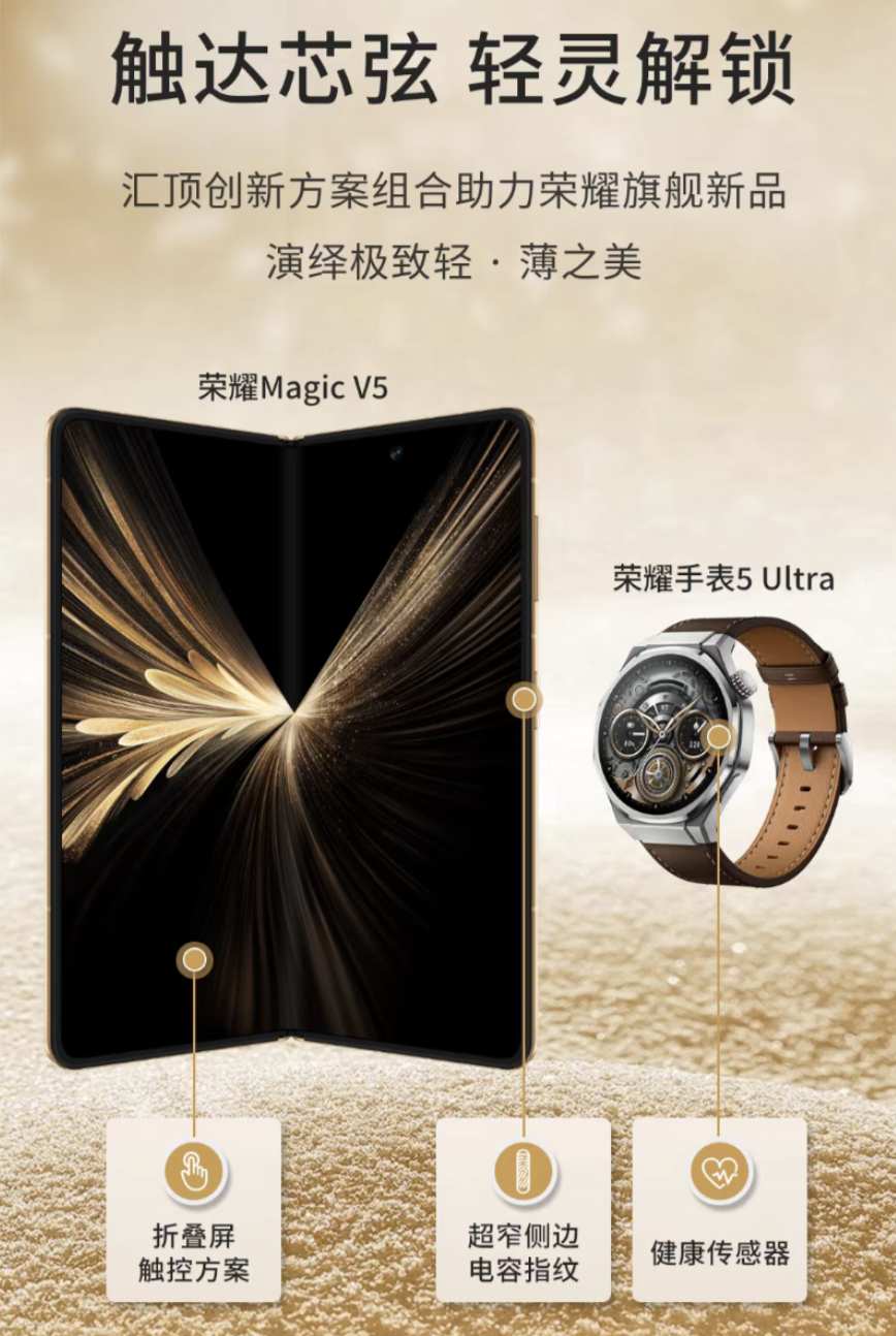 榮耀Magic V5與手表5 Ultra的成功離不開先進(jìn)技術(shù)的加持,其中匯頂科技的觸控與健康監(jiān)測方案為兩款產(chǎn)品的核心體驗(yàn)提供了堅(jiān)實(shí)基礎(chǔ)。Magic V5的折疊屏觸控方案與超窄側(cè)邊指紋技術(shù),不僅優(yōu)化了觸控響應(yīng)與解鎖便捷性,還助力其實(shí)現(xiàn)極致輕薄設(shè)計(jì);而手表5 Ultra的健康傳感器芯片則確保了精準(zhǔn)的健康數(shù)據(jù)采集與低功耗運(yùn)行。這些技術(shù)的融入,使榮耀的AI生態(tài)策略更加完整,展現(xiàn)了半導(dǎo)體與智能終端的深度協(xié)同。