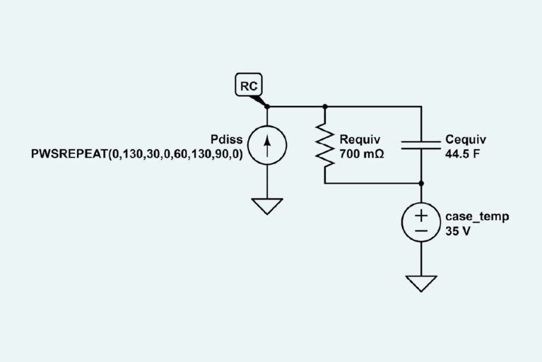 該等效電路假設(shè)封裝頂部和底部均進(jìn)行冷卻,等效熱阻為 0.7°C/W,外殼溫度為35°C,模塊的熱容為 44.5J/K,并且模塊在 30 秒開、30 秒關(guān)的持續(xù)重復(fù)脈沖期間耗散 130W 的功率。