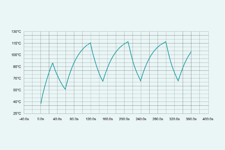 圖6在以下運(yùn)行條件下模擬的 BCM 脈沖功率熱力學(xué):VHI為520,VLO 為32.5,低側(cè)峰值輸出電流為 80 A。第一個功率脈沖顯示最高內(nèi)部溫度升高至約 90°C,隨后升高至約 115°C。重復(fù)脈沖顯示最高內(nèi)部溫度限制在約 115°C。