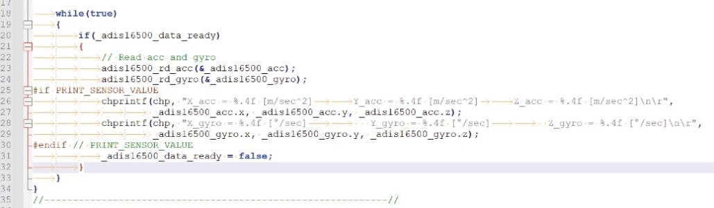 在此示例中,main.c中有一個無限循環(huán),始終檢查名為_adis16500_data_ready的布爾靜態(tài)變量。該變量與回調(diào)函數(shù)相關(guān),當(dāng)DR引腳變?yōu)楦唠娖綍r,它將切換到TRUE,這意味著已有新數(shù)據(jù)可用。在這種情況下,主函數(shù)將調(diào)用adis16500_rd_acc和adis16500_rd_gyro函數(shù)。通過全速運行IMU傳感器,設(shè)計人員將能夠以2 kHz的輸出數(shù)據(jù)速率(ODR)獲取數(shù)據(jù)。