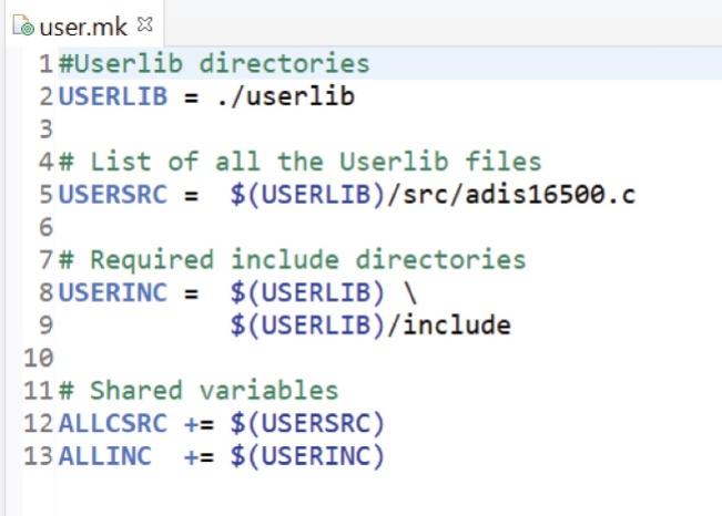 傳感器驅(qū)動程序沒有通用的組織結(jié)構(gòu)。圖1所示為建議的文件夾結(jié)構(gòu)。userlib文件夾中包含所有傳感器驅(qū)動程序。在本示例中,只有IMU傳感器驅(qū)動程序,但如果項目包含更多傳感器,組織方式基本相同。userlib中有兩個文件夾,分別是include和src。include文件夾包含驅(qū)動程序的標(biāo)頭文件,即本例中的adis16500.h,而src中包含源文件,即adis16500.c。userlib中還有一個指定include指令的makefile,如圖2所示。