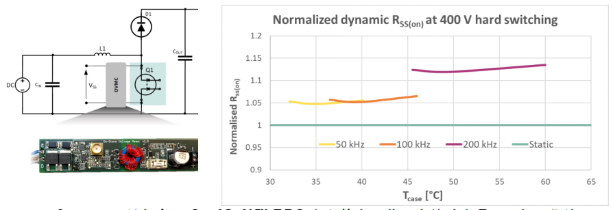 動態(tài)源-源導(dǎo)通電阻Rss(on)可反映CoolGaN? BDS在連續(xù)開關(guān)期間的實際性能,該參數(shù)受阻斷電壓、開關(guān)頻率及溫度的三重影響。利用改進(jìn)版自補(bǔ)償雙二極管通態(tài)壓降測量電路(OVMC),搭建一個升壓轉(zhuǎn)換器測試裝置:其中,BDS作為低邊開關(guān),SiC肖特基二極管作為高邊開關(guān)并處于連續(xù)導(dǎo)通模式(CCM)。