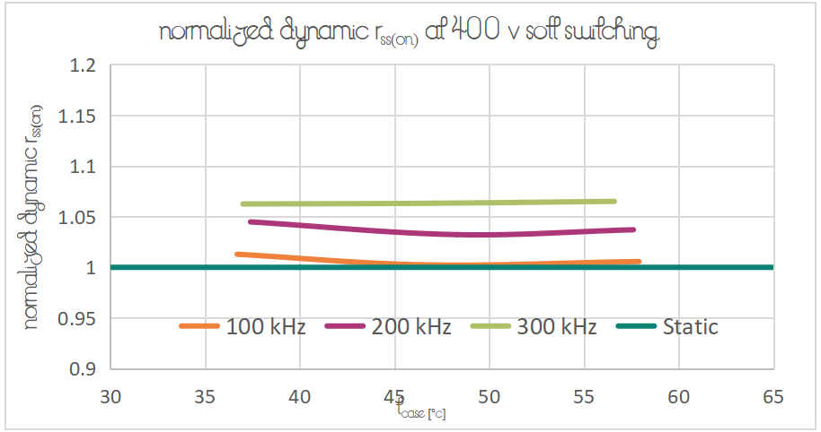 圖3:不同開關(guān)頻率下CoolGaN? BDS在完整殼溫范圍內(nèi)的動態(tài)Rss(on)歸一化值