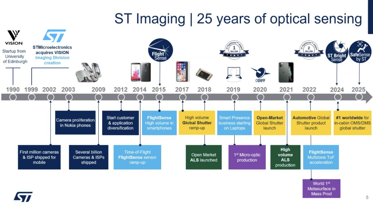 ST影像部門的發(fā)展始于1999年對蘇格蘭Vision公司的收購,開啟了其在機(jī)器視覺和光學(xué)技術(shù)領(lǐng)域的探索。2003年,諾基亞手機(jī)的普及推動了攝像頭市場的黃金時(shí)代,ST借此奠定了影像技術(shù)的市場基礎(chǔ)。隨著諾基亞業(yè)務(wù)的衰退,ST通過技術(shù)多元化戰(zhàn)略推出了FlightSense品牌。FlightSense基于ToF技術(shù),提供高性能、低成本的測距解決方案,在安卓手機(jī)的自動對焦輔助功能中獲得廣泛應(yīng)用。